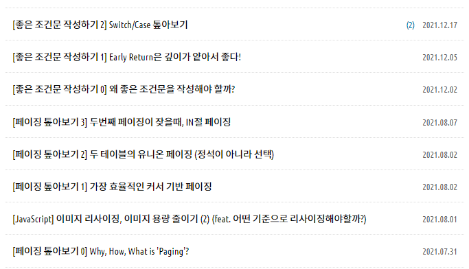 위의 시니어들의 피드백에 하나 같이 칭찬했던 부분은 반기별 회고록을 작성한 부분이었다. 역시 기록이 성장의 열쇠이자 또 성장하는 사람처럼 보이기 좋다는 생각이 들었다. 안 그래도 티스토리 기술 블로그를 열심히 운영해봐야겠다 했었는데, 본격적으로 운영해야겠다는 생각이 올려 폭풍 포스팅을 시작했다. 블로그 운영 경험이 있기 때문에 마음만 먹으면 1일 1포스팅도 어렵지 않다 생각이 들었지만, 기술적인 글을 쓴다는 게 일반 글을 쓰는 것보다는 꽤 어렵게 느껴져 많이 쓰고 있지는 못하고 있다. 일단 메모장에 쓰고 싶은 주제들 와장창 적어두고 있다.