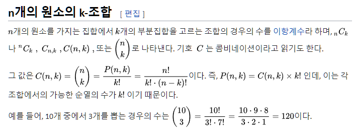 정확히는 이항계수를 구해야하는데 이항계수란 다음과 같다.