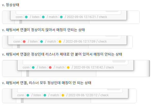 이슈 케이스를 찾을 수 없다면 이슈 케이스를 잘 찾아낼 수 있도록 하는 것이 첫째라 생각했기 때문에, 내부 테스터들을 대상으로 모니터링할 수 있는 '상태바' 기능을 만들고, 유실 케이스를 명확하게 인식할 수 있도록 유실 복구된 메시지를 '하이라이팅'하였다.