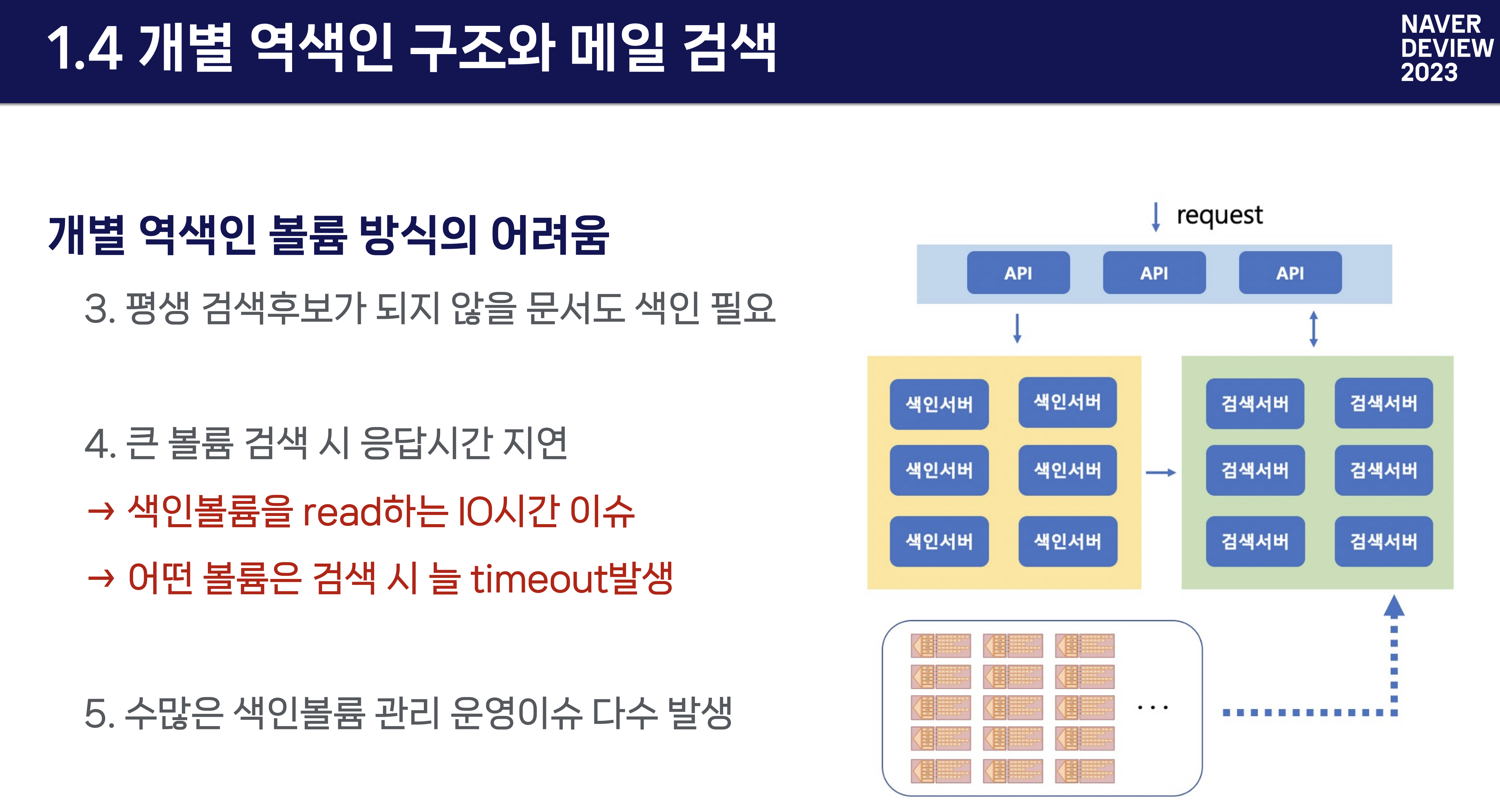 최초 <개별 역색인 볼륨> 방식으로 검색 시스템이 구축되어있었다고 한다. 그 시스템이 대용량 검색 시스템에는 정석인 시스템으로 알고 있었는데 그 부분이 단점이 많다는 식으로 이야기가 시작되다 보니 굉장히 흥미로웠다.