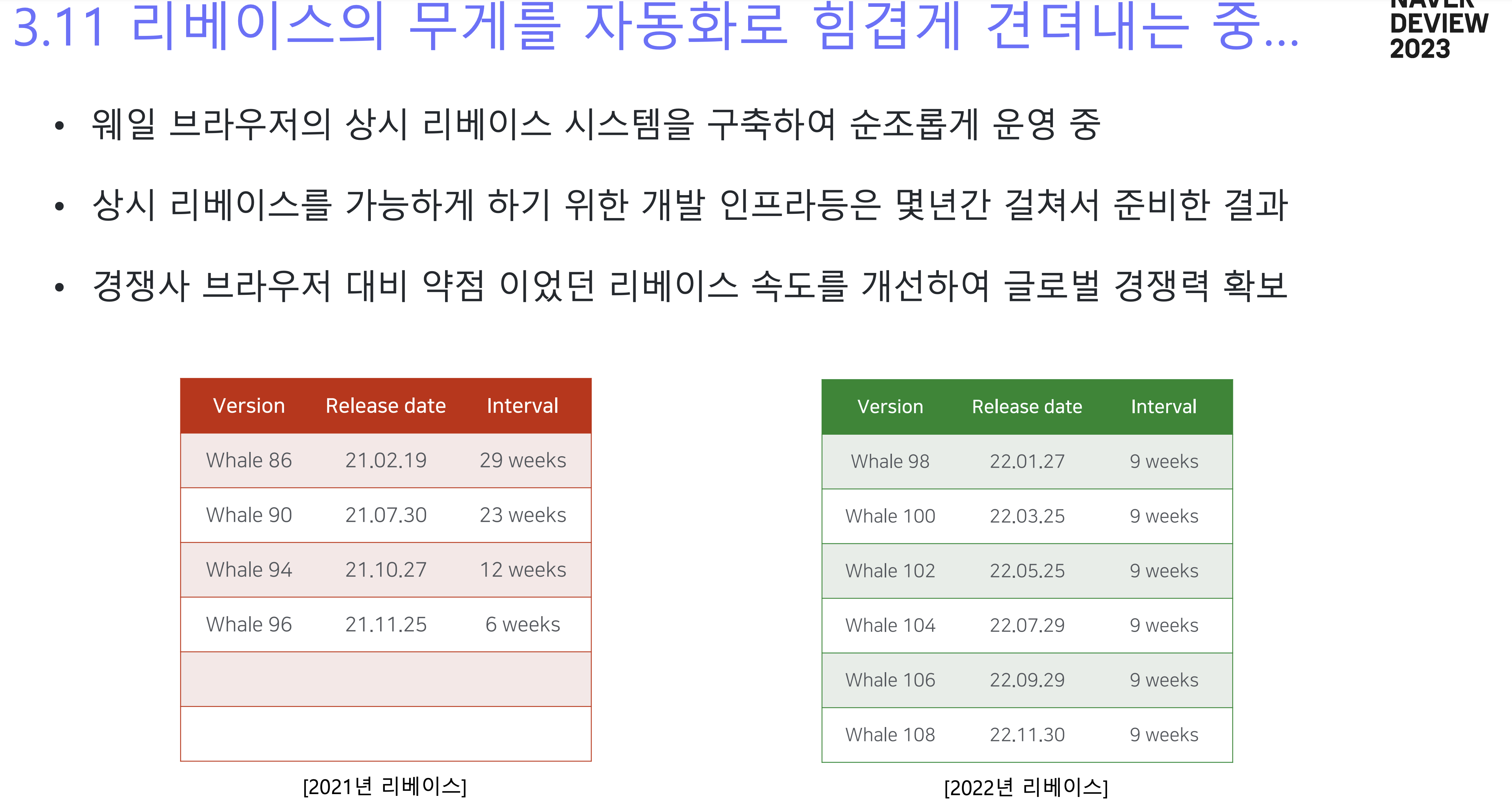 그래서 2020년부터 19주, 29주, 23주, 12주 등의 간격으로 배포를 해오다가 생존을 위해 8주 고정 리베이스 배포 프로젝트를 시작했다고 한다.