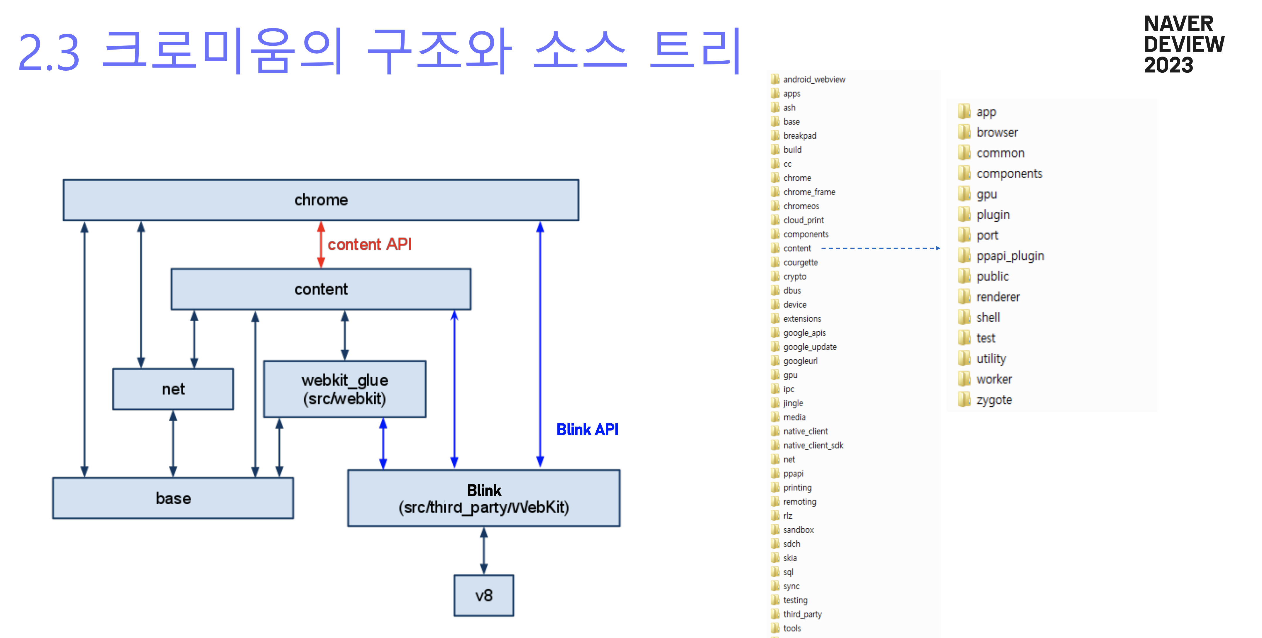 서두에 크로미움 오픈소스에 대한 설명과 '브라우저 개발에 있어 오픈소스 활용을 필수다'라고 설명해 주셨다. 첫 번째 강의와 달리 알고 있는 부분들이 있어서 이해가 잘 되었다. '오픈소스 크로미움은 엄청 어려운 게 아니다'라 하시며 웹엔진에 해당하는 content 폴더를 잘 살펴보면 충분히 이해 가능한 부분이니 한번 훑어봐도 좋다는 팁을 주셨다.