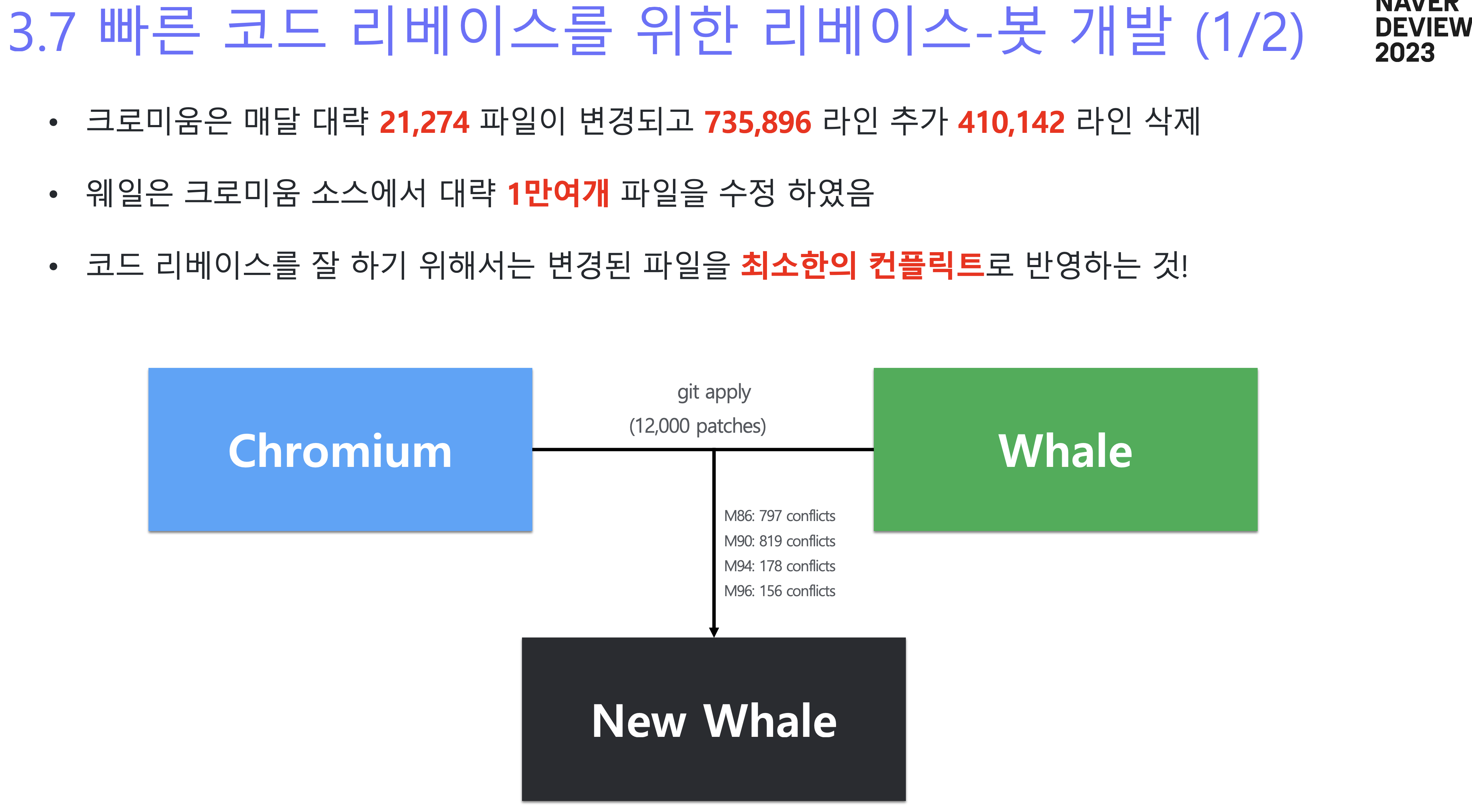 오픈소스 버전이 지속 업데이트 됨에 따라 웨일 브라우저 이를 잘 따라가며 개발하기 위해서는 '리베이스'를 해야 한다고 했다.