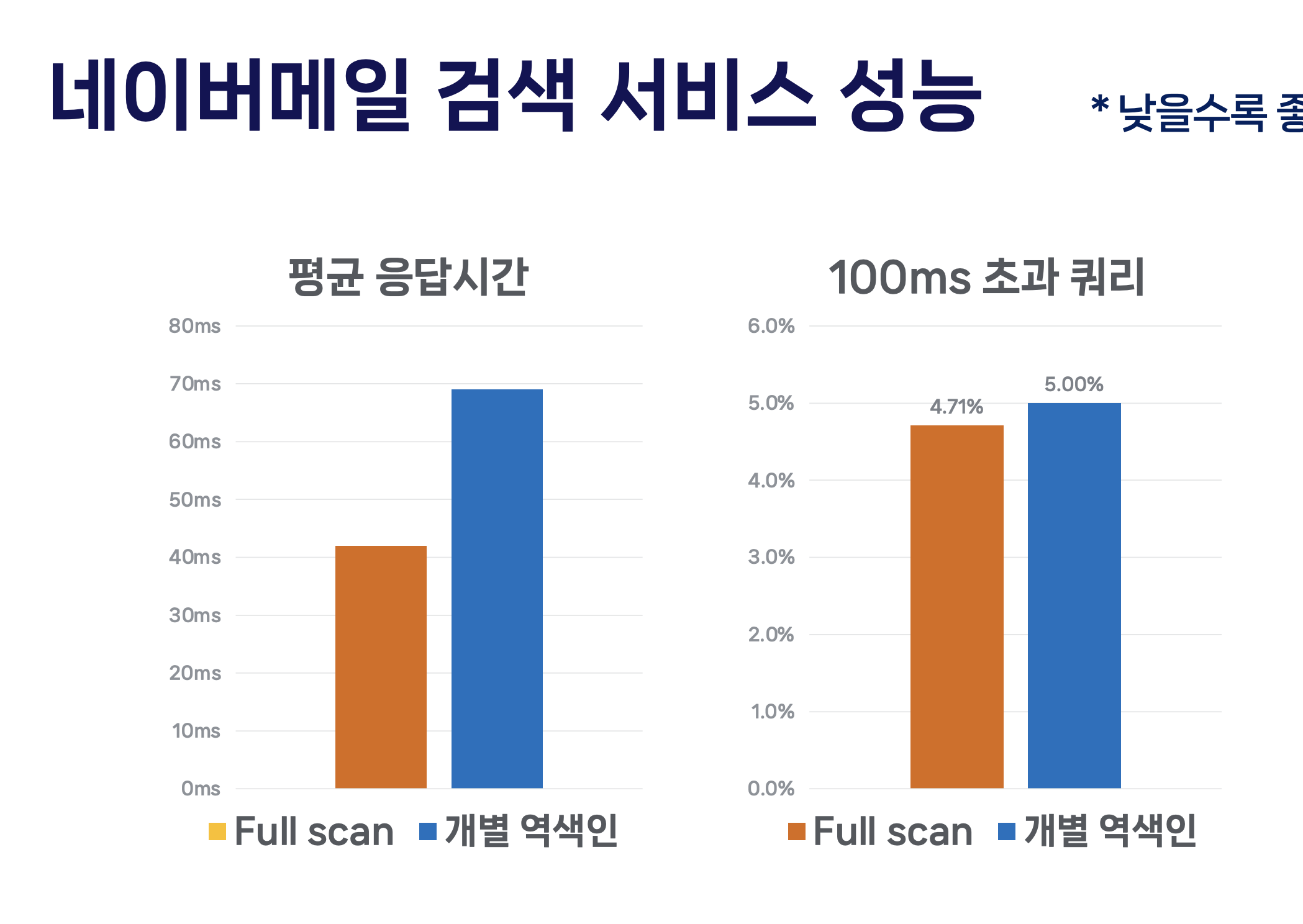 네이버메일 검색 기능을 평균 70ms => 40ms로 줄였다고 하니 좋은 방법이라고 보인다. 소개하기로는 성능 개선이 될뿐더러 검색서버를 100대 => 30대로 줄이고 색인서버 150대를 없애는 인프라적 성과를 냈다고 한다. 메일이 2,607만 개가 있는 해비유저를 중간에 보여줬는데 이거를 풀스캔 방식으로 검색을 몇 초로 끊어냈는지 궁금하다. (평균도 중요하지만 해비유저에 대한 값도 중요하니깐..)