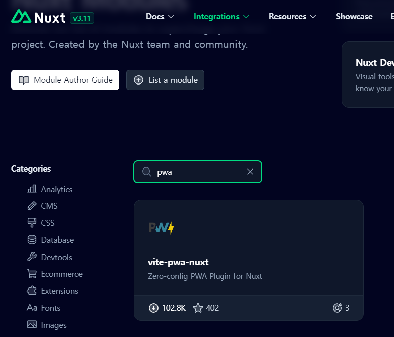 1. nuxt 3 > integrations > modules > 'PWA' 검색