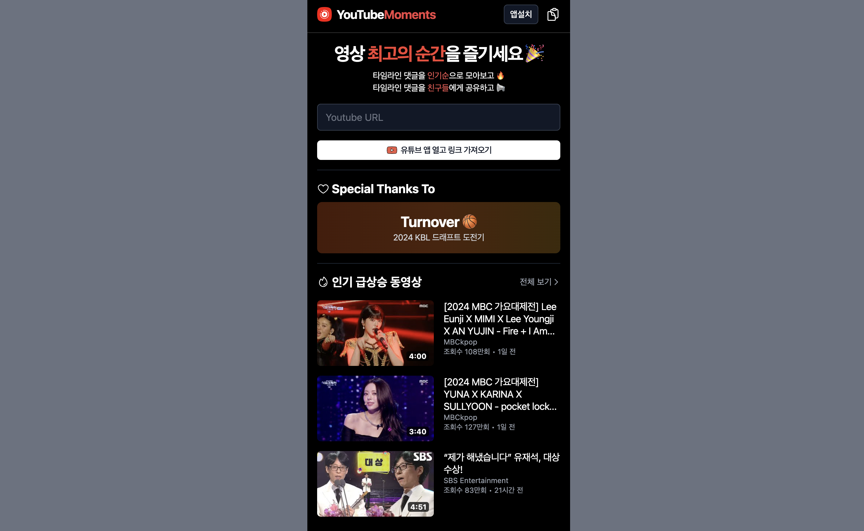 최종적으로 YoutubeMoments라는 유튜브 명장면 추출 & 공유 서비스를 만들었다. 쓰레드에 홍보하고 서버가 터지는 등 인상 깊은 순간들은 있었으나 계속 디벨롭시키지는 못했다. 유튜브 앱에서 바로 쓸 수 있으면 훨씬 좋을 텐데 별도 서비스에서 해야 할 만큼 개선하지는 못했다. 가진 것을 잘 활용해서 유튜브 프로그램 "턴오버"를 기념하여 영상 모음을 만들어주었고 개개인에게도 전달해 드렸다. 수익은 1도 못 만들어냈지만 유의미하지 않았나 싶다.